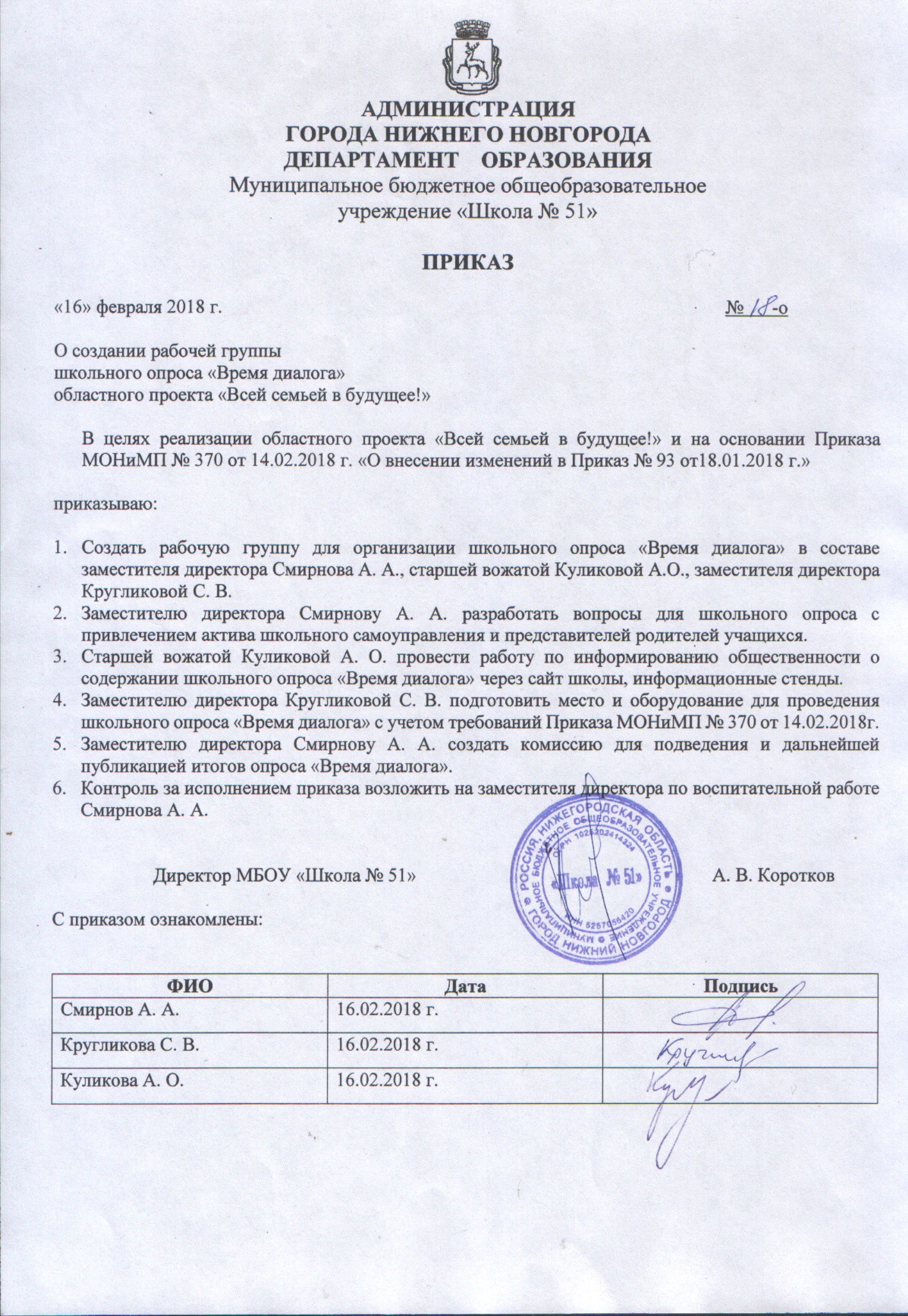 - Приказ МБОУ "Школа № 51" №18-о о создании рабочей группы школьного опроса "Время диалога"